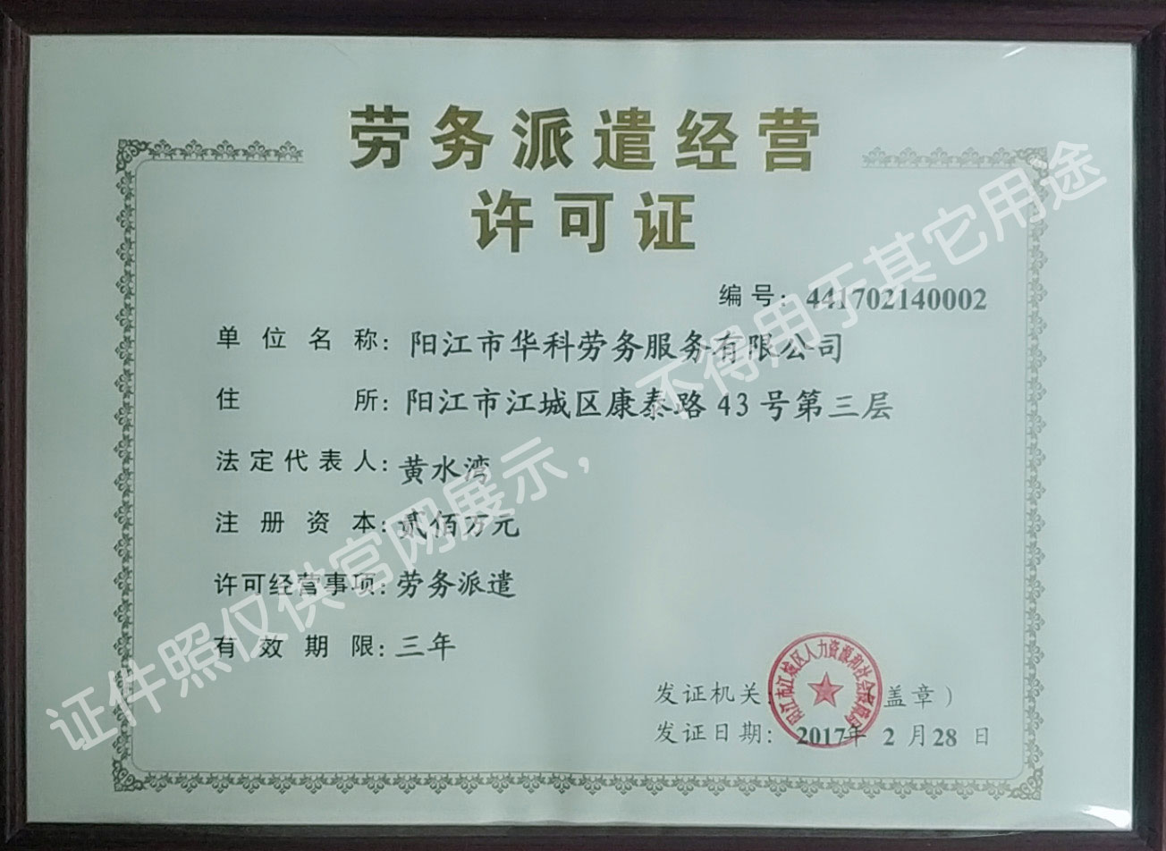 陽江市華科勞務(wù)服務(wù)有限公司是專業(yè)從事勞務(wù)外包、人事代理、勞務(wù)租賃、人力派遣及管理的綜合性服務(wù)機(jī)構(gòu),是首批獲得廣東省人力資源廳、陽江市勞動(dòng)和社會(huì)保障局頒發(fā)人力資源許可證的合法單位?!罢\信務(wù)實(shí)、專業(yè)熱情、滿意第一、服務(wù)社群”的經(jīng)營理念,在勞務(wù)派遣業(yè)務(wù)的基礎(chǔ)上,更致力于合同制工人(臨時(shí)工、實(shí)習(xí)生、假期工)方向發(fā)展,為用工企業(yè)及時(shí)輸送合格的各類人才,合理調(diào)配人力資源的有序流動(dòng),幫助求職者尋求更加滿意的就業(yè)渠道和崗位,切實(shí)維護(hù)求職者的合法權(quán)益。